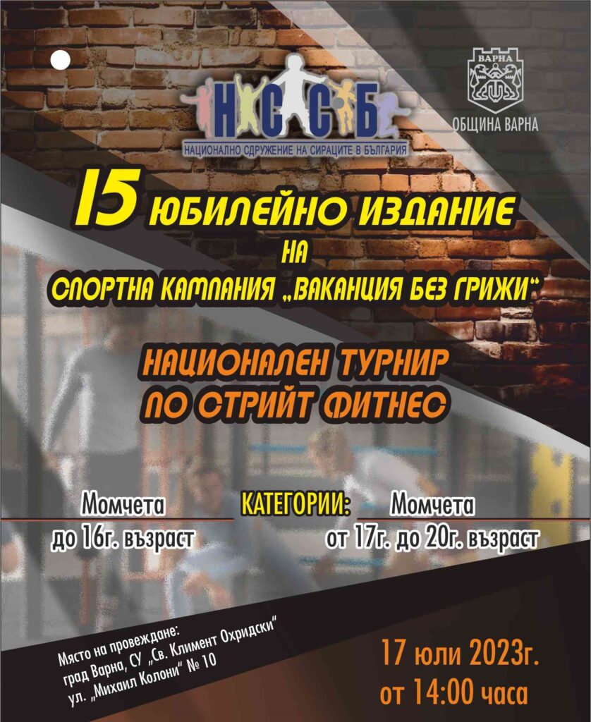 Националното сдружение на сираците в България /НССБ/ организира XV юбилейно издание на спортната кампания „Ваканция без грижи“. То ще започне от 14:00 часа на 17 юли на спортната площадка в СУ „Св. Климент Охридски“ във Варна.