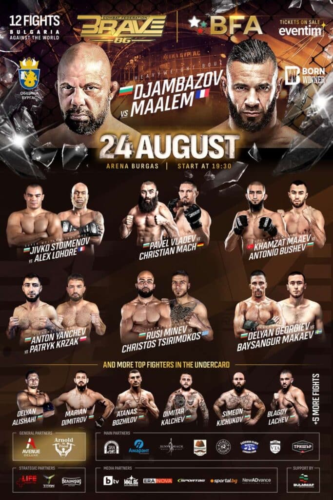 Ветеранът на българския ММА Атанас Джамбазов /25-5/ ще се изправи срещу една от звездите на BRAVE, Мохамед Саид Маалем /12-6/ в тежка категория. Джамбазов, който от години живее и тренира в Лас Вегас, е един от най-опитните бойци в България и помага в подготовката на UFC бойци като Франсис Нгану и Александър Волков. От своя страна, Маалем има впечатляваща кариера с 6 битки в BRAVE и е бивш шампион на организацията в полутежка категория.