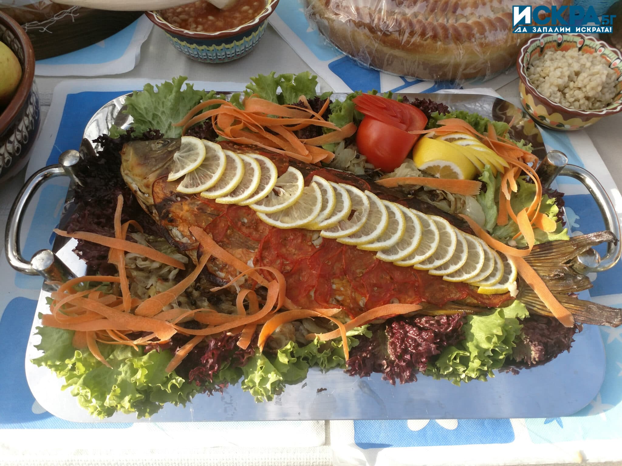 По традиция на трапезата се поставя риба, която има люспи. Най-често това е шаранът и затова той присъстваше на празничната трапеза, която беше осветена в градинката на Часовника.