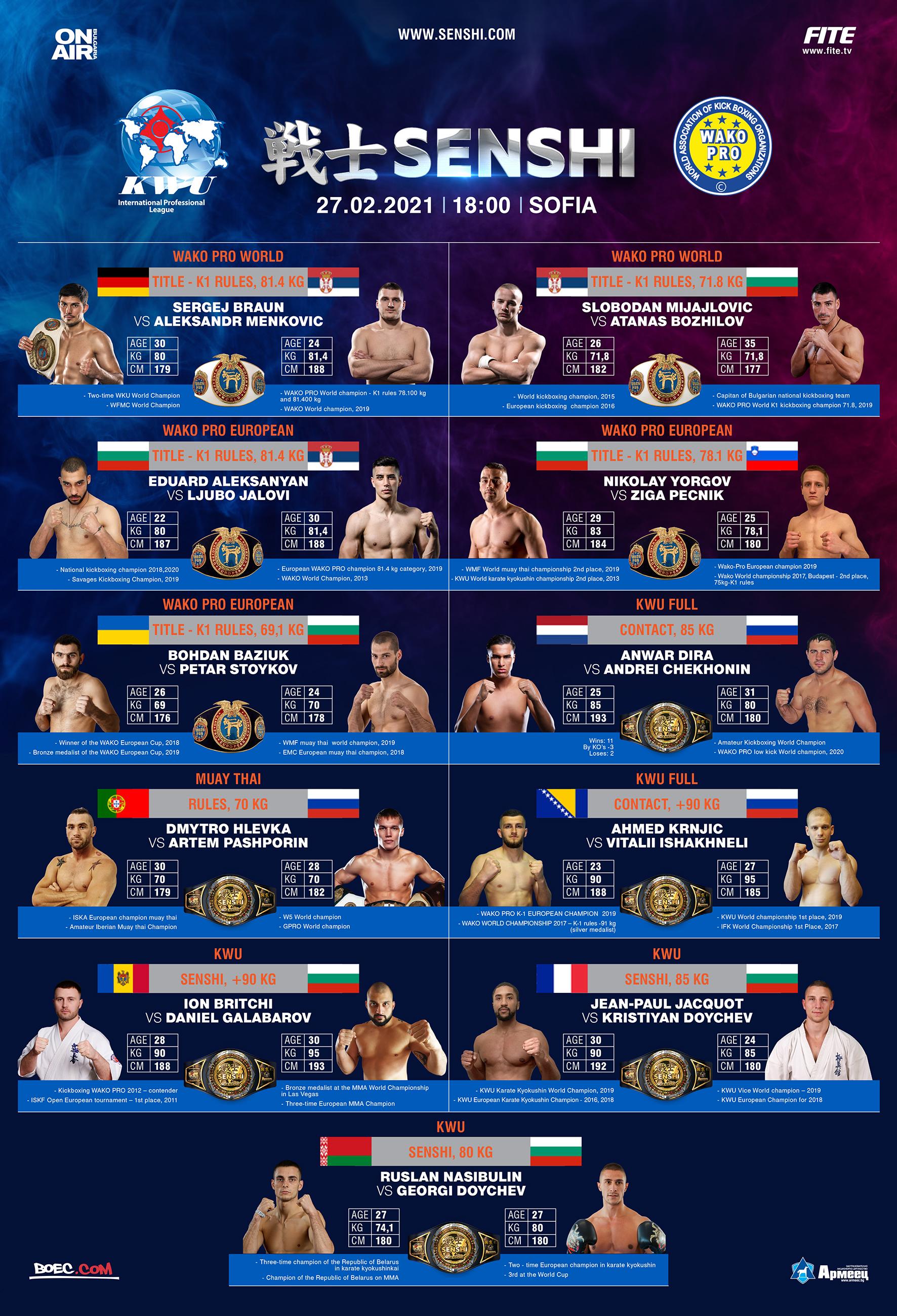Претендент за Европейската титла на WAKO PRO до 78.1 кг по правилата К-1 ще бъде Николай Йоргов. Негов опонент ще бъде Жига Печник от Словения. Родният ни ас е сребърен медалист от световното първенство по муай тай WMF 2019 г. и от световното първенство по карате киокушин KWU от 2013 г. Освен многократен републикански шампион, Йоргов е шампион на Япония за 2011 г. и вицесветовен шампион по Шинкен шобу през 2012 г. Съперникът му Жига Печник за пръв път ще се качи на ринга на SENSHI. През 2019 година той става Европейски шампион нa WAKO PRO, а през 2017 г. става и вице-световен шампион от първенството на WAKO в Будaпеща в кат. до 75 кг по правилата на К1.