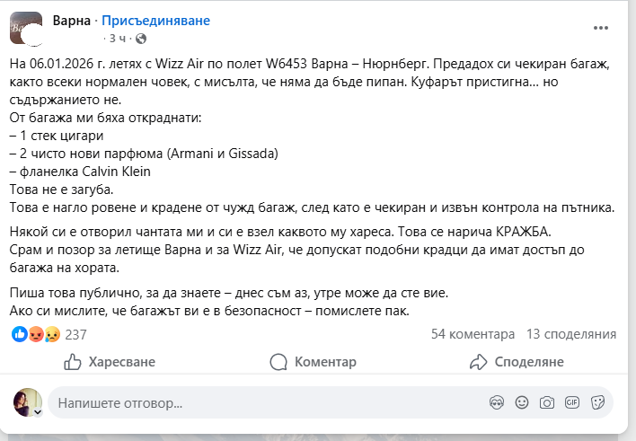 Мъж твърди, че е била извършена кражба от чекирания му багаж по време на полет от Варна до Нюрнберг. Той сподели за случилото във Facebook, а публикацията му предизвика бурна реакция, като десетки пътници споделиха за сходни преживявания и съветват засегнатия да търси правата си.