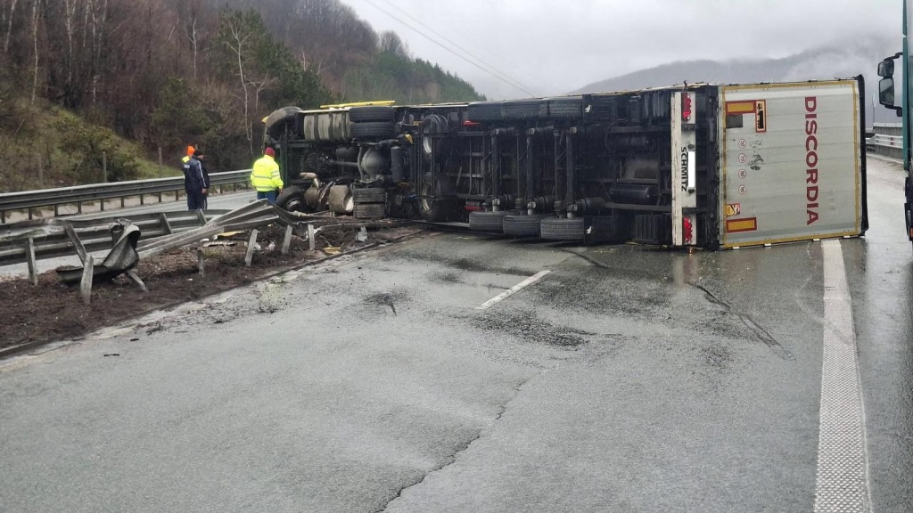 Тир е блокирал движението по автомагистрала „Хемус“, след като се е обърнал в участъка между тунелите „Витиня“ и „Топли дол“, в посока Ботевград.
