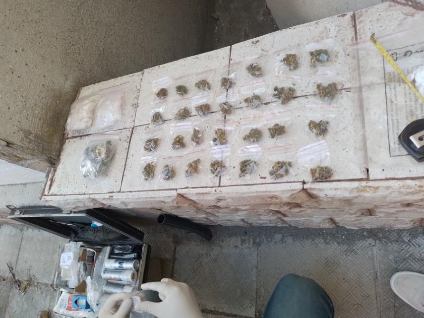 Откритии иззети са множество пликчета и чаши с жълтеникаво кристалообразно вещество, реагирало при направения полевия наркотест на метамфетамин /общото тегло на намерения наркотик е около 20 грама/.