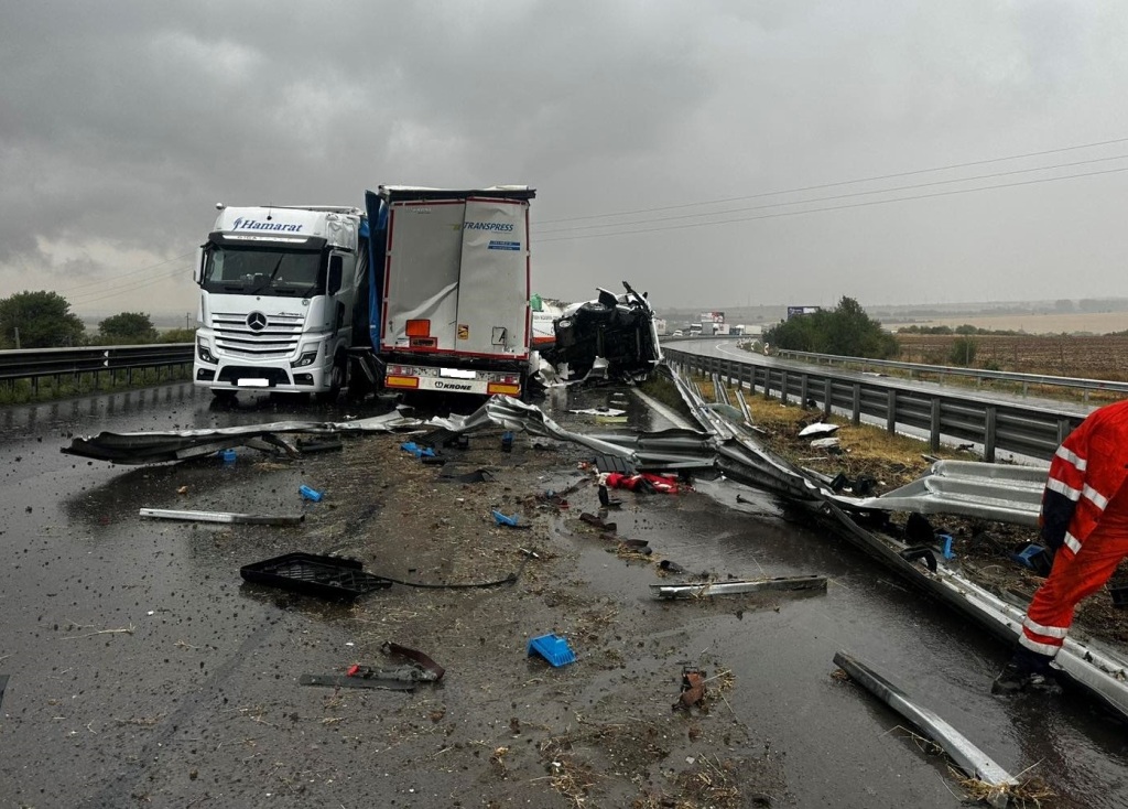 Тир, движещ се в посока София, премина през мантинелите в насрещното платно и се блъсна в движещ се по него друг тежкотоварен автомобил.