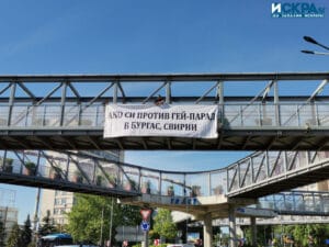 ОЗБГ и „Групата на групите“ днес опънаха транспарант на пасарелката на кръговото кръстовище на „Трапезица“ в Бургас. С него се призовават всички шофьори, които не са съгласни с гейпарада, да натиснат клаксоните на своите автомобили. По този начин те ще покажат ясно, че не искат в морския град да се провеждат подобни събития.
