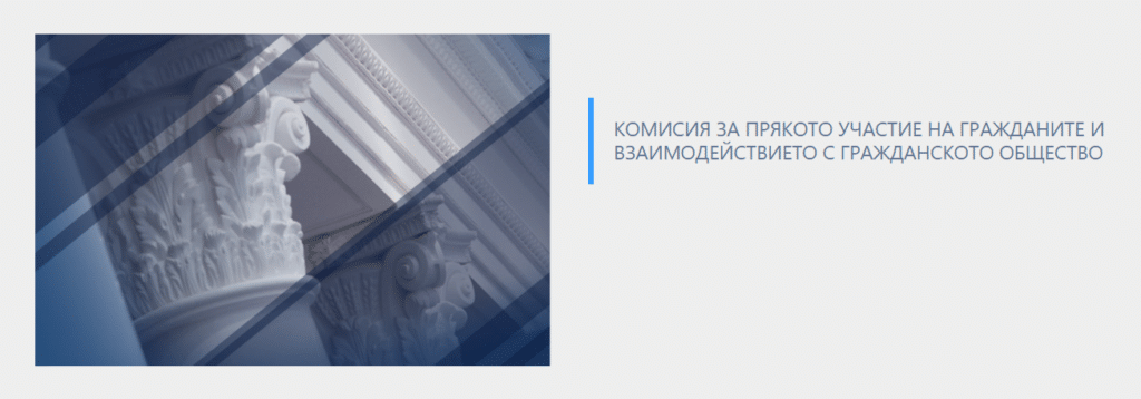 Към 47-о Народно събрание на Република България има 24 постоянни комисии и една от тях е „Комисия за прякото участие на гражданите и взаимодействието с гражданското общество“. Като част от тази комисия е създаден Обществен съвет, в който влизат и неправителствени организации, отговарящи на определени условия.