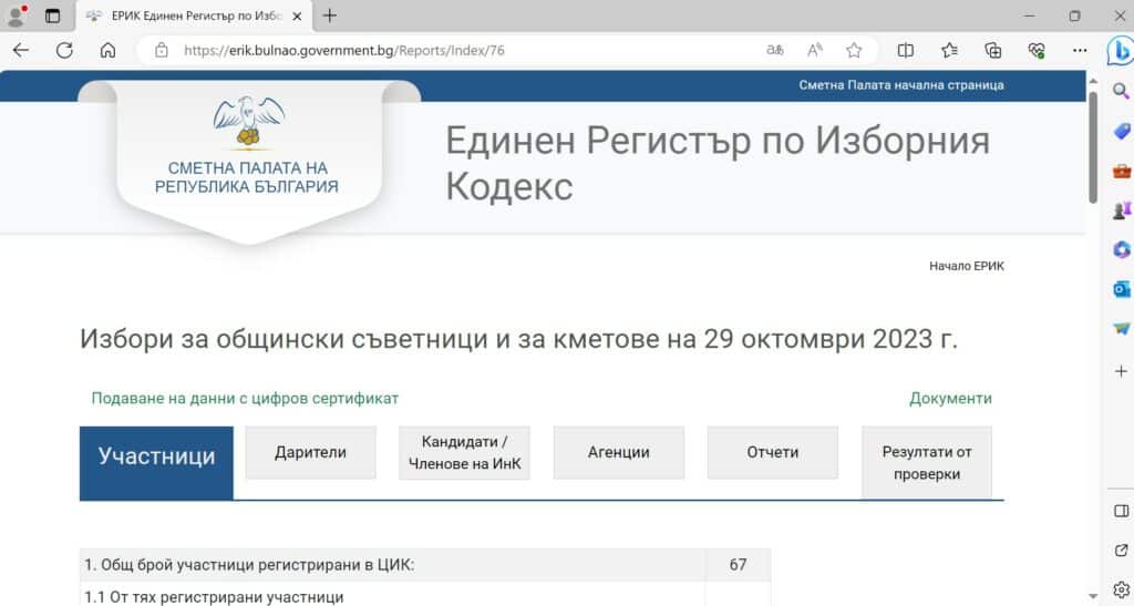 Партиите, коалициите и инициативните комитети, регистрирани за участие в избори, вече имат възможност да обявяват дарителите си по електронен път чрез цифров сертификат. Това стана възможно, след като „Информационно обслужване“ АД надгради поддържания от Сметната палата Единен регистър по Изборния кодекс /ЕРИК/.