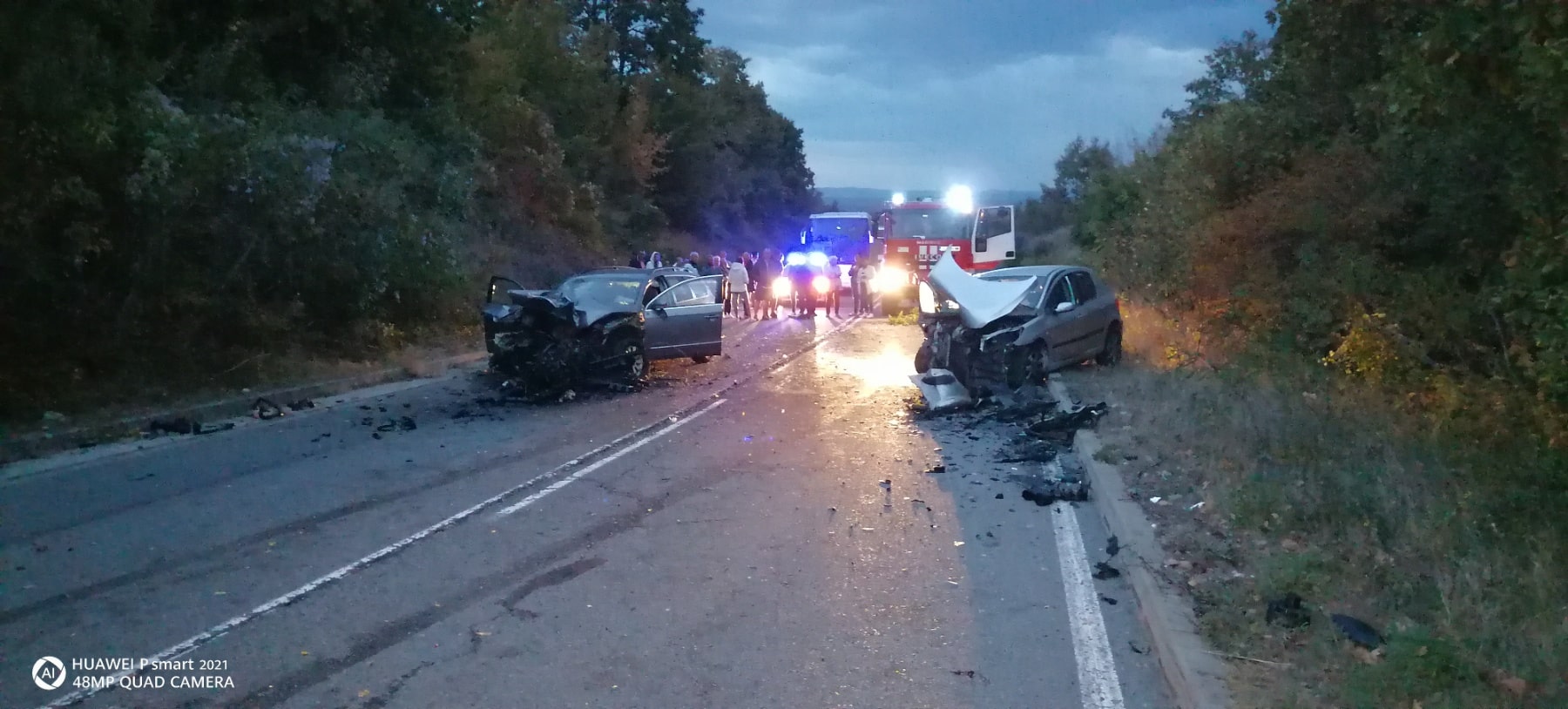 Лек автомобил с румънска регистрация, в който са пътували мъж и жена от Румъния, се е забил в кола с бургаска регистрация, в която са пътували семейство с две деца. Причината за челната катастрофа е загуба на контрол.