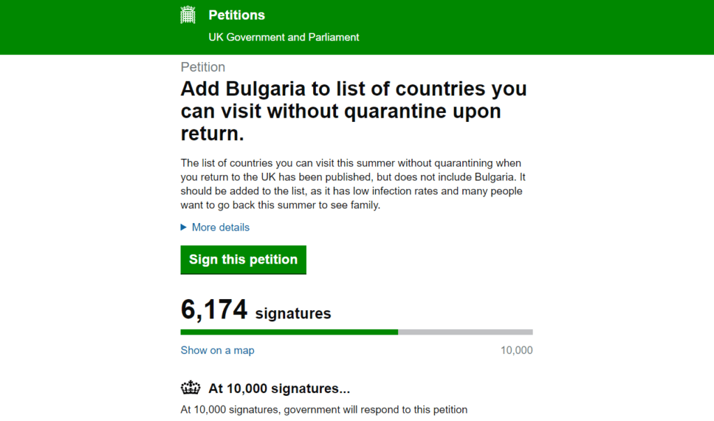 Петиция за премахването на карантината за пристигащи във Великобритания от България се разпространява в интернет вече втора седмица. До момента тя има събрани 6 174 подписа.