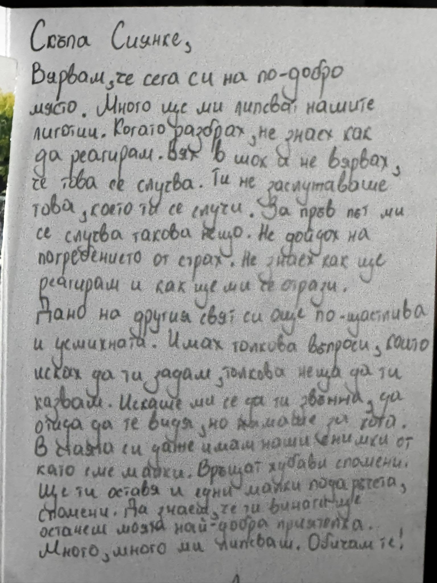 Днес близки и роднини изпратиха по последния ѝ път 12-годишната Сияна Попова, която загина при тежка катастрофа в Плевенско. След погребението, бащата на детето Николай Попов сподели в социалните мрежи прощално писмо, написано от най-добрата приятелка на Сияна. По думите му, момичето е помолило родителите си писмото да бъде сложено при Сияна.