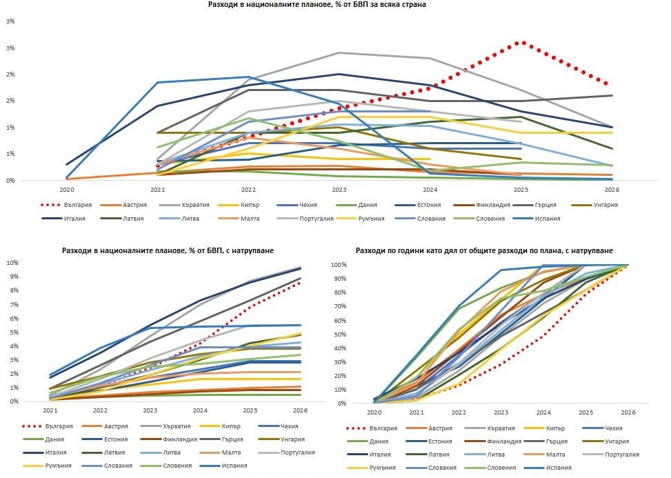 Ако сравним концентрирането на очаквани разходи, финансирани по плановете през 2021-2023 г., България се очаква да е на последно място през 2022 г., през 2021 г. има две страни, които ще похарчат по-малък дял от целия си план, а през 2023 г. – само една. Независимо, че България е сред най-големите бенефициенти на безвъзмездна помощ от механизма за възстановяване и устойчивост, през 2021 г. ще има 12 страни, в които инвестициите за сметка на плана ще са по-високи като дял от БВП, през 2022 г. – 10, а през 2023 г. – 5. За сметка на това, през 2025 и 2026 г. в България ще харчим най-много като дял от БВП от парите по механизма.