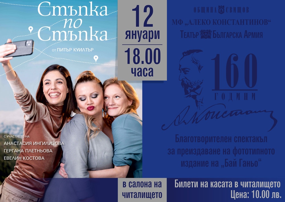 Пиесата се казва „Стъпка по стъпка“ и в нея участва актрисата Гергана Плетньова, която е свързана със Свищов и още Анастасия Ингилизова, Евелин Костова, Даниел Върбанов, Денислав Маринчев, Стефан Роглев. Авторът е Питър Куилтър, а постановката е на Лиза Шопова. Сценография и костюми – Анелия Райкова. Музикална среда – Петя Димитрова.
