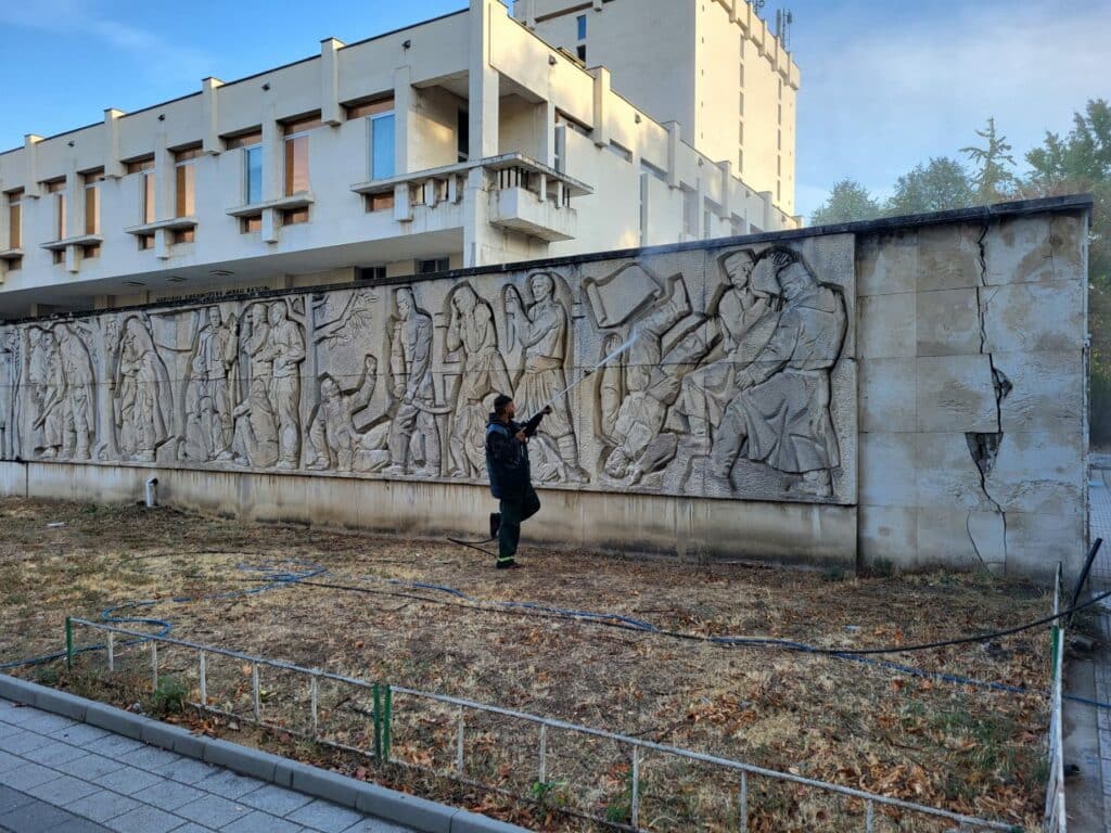 Екип на общинското предприятие „Чистота“ в Пловдив почисти и освежи барелефите, които се намират в предверието на народната библиотека „Иван Вазов“, както и облицовката на стълбището .