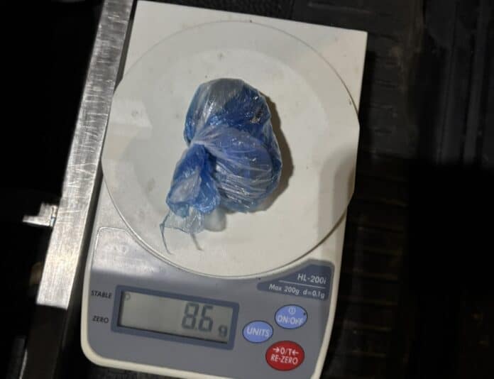 При направения оглед на улицата пред адреса, от външната страна на оградата на тротоара срещу къщата, са открити и иззети найлонов плик, съдържащ бяло прахообразно вещество под формата на бучка с неправилна форма с тегло 10,9 грама, реагиращо на амфетамин при полеви наркотест. От външната страна на стара сграда срещу къщата е открит найлонов плик, съдържащ 8,6 грама суха зелена тревиста маса, реагираща на канабис при наркотест.