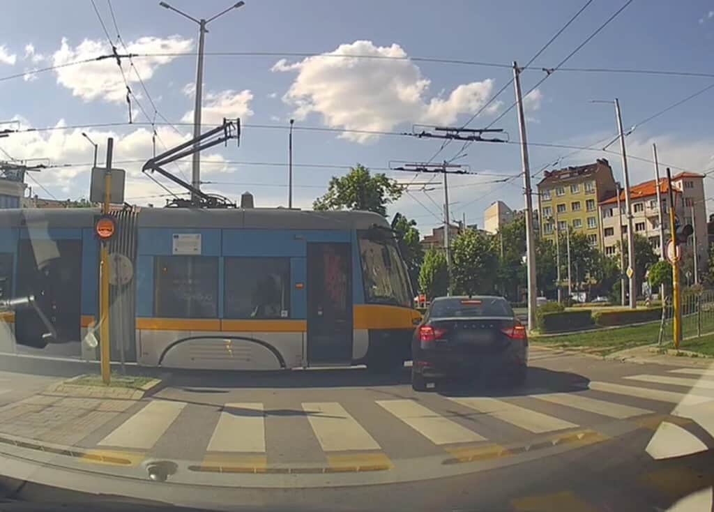 Трамвай е блъснал лек автомобил в района на Руски паметник в София днес следобед. Видео от инцидента бе публикувани във Facebook от шофьор, който заснема пътния трафик с камера на предното стъкло на колата.