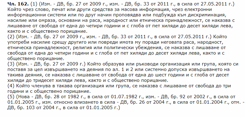 Според Наказателния кодекс, член 162, това е престъпление, което се наказва с лишаване от свобода от една до четири години и с глоба от пет хиляди до десет хиляди лева, както и с обществено порицание.