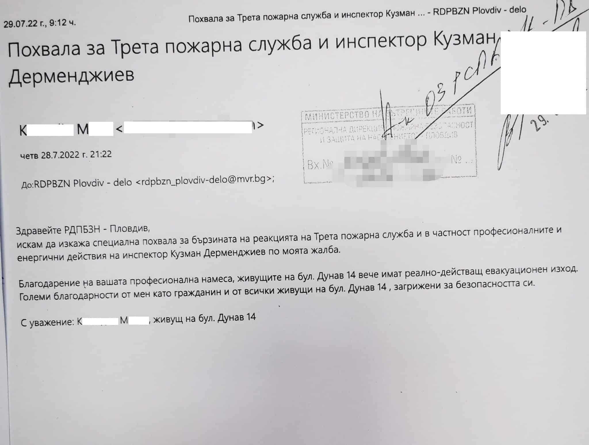 Пожарникарите припомнят, че през летните месеци съзнателни жители на различни адреси в Пловдив, са подавали сигнали до районни службите, че част от входовете на блоковете, за които отговарят, са напълно затворени. Един такъв пример е свързан с невъзможността за евакуация на живущи в 14-етажен жилищен блок на бул. „Дунав“. След като се свързаха с пожарната служба и информираха за заварена врата на вход, служещ за евакуация, инспектор е извършил проверка и е направил предписание за отстраняването й. Само ден по-късно проблемът е бил решен, а хората – спокойни и сигурни.
