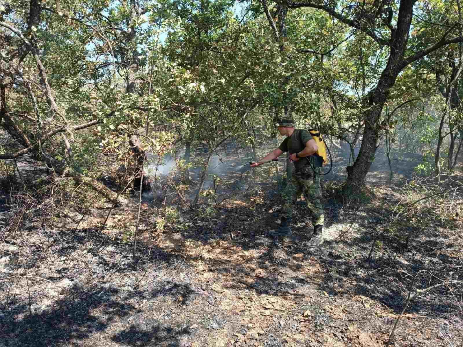 48 военнослужещи с 12 единици техника, под ръководството на заместник-командира на 1-ви механизиран батальон майор Пламен Великов от 61-ва Стрямска механизирана бригада – Карлово, продължават усилията от предходните дни за погасяването на разрасналия се горски пожар.