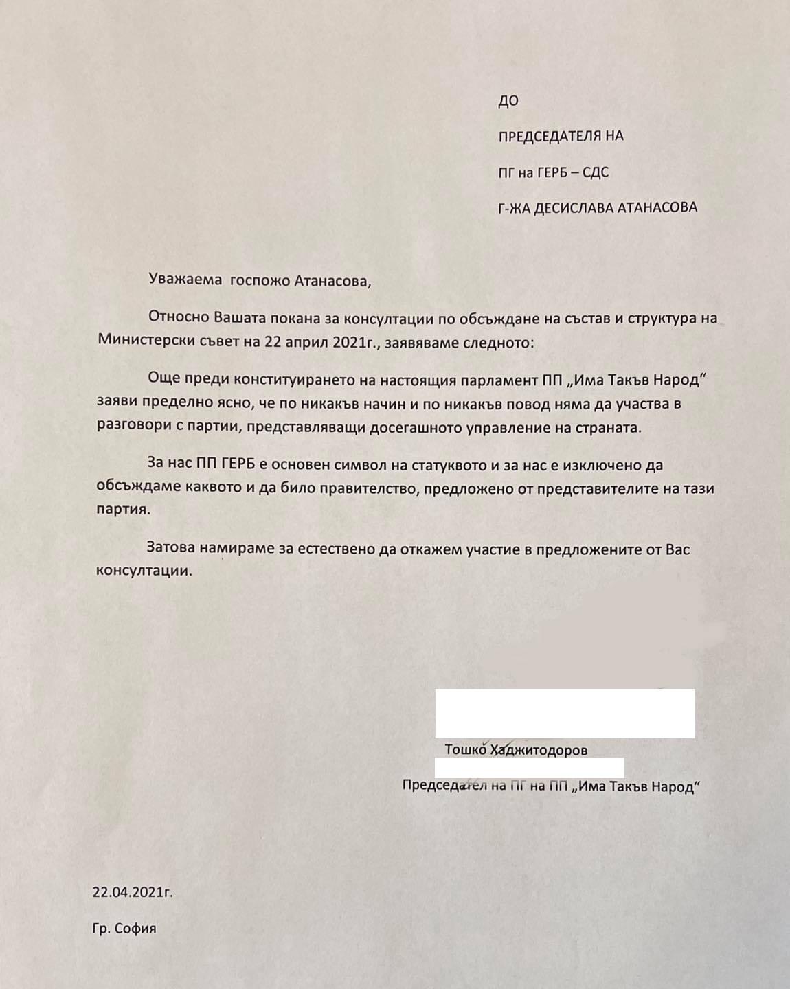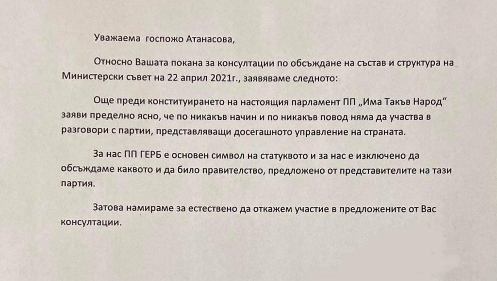 От ПП „Има такъв народ“ отказаха да проведат консултации по обсъждане на състав и структура на Министерски съвет с политическата група на ГЕРБ. Във Facebook те публикуваха отговора си към тях и коментираха: