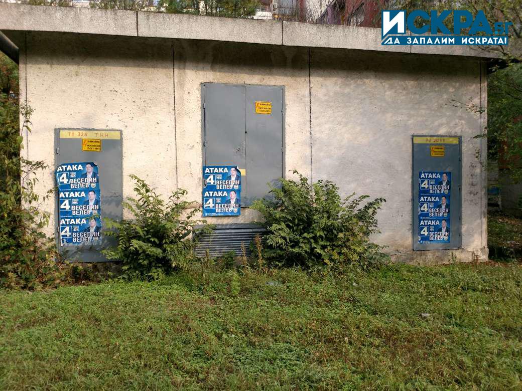 В комплекс „Братя Миладинови“ на трафопоста срещу блок 62, както и до него, стоят плакатите на кандидата за общински съветник от ПП „Атака“ Веселин Велев. А на фасадата на известно заведение в Морската градина пък може да се види този на общинския съветник от Движение България на Гражданите Манол Тодоров.