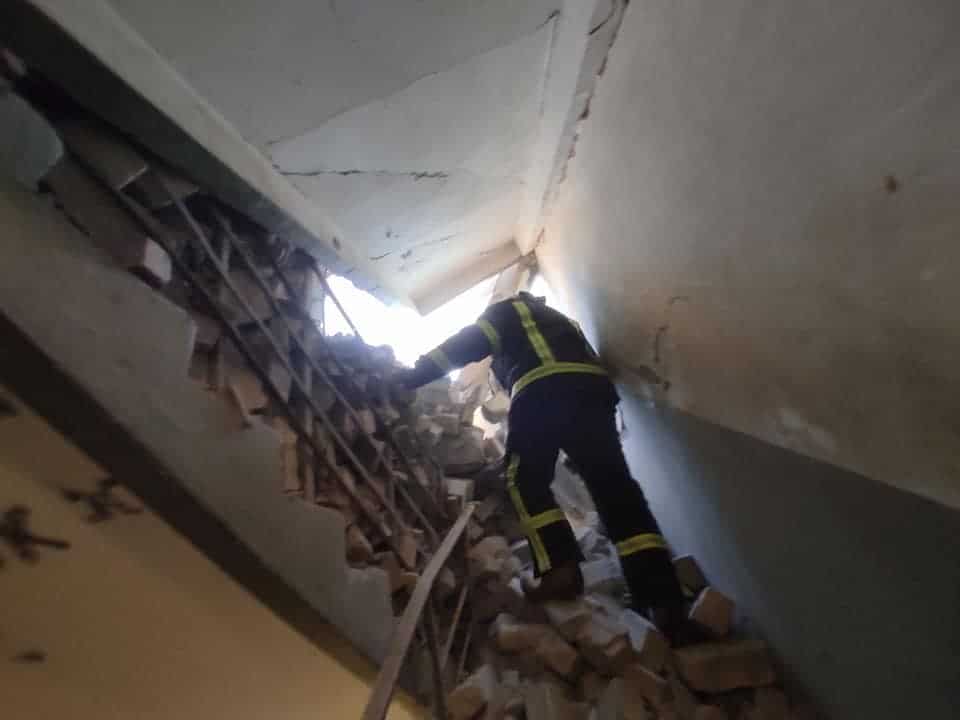 Сигнал е получен в 06:16 часа. Последният етаж на 12-етажна сграда е бил срутен в резултат на падането на осколки от снаряди. Вследствие на атаката е пострадала и съседната 9-етажна сграда.
