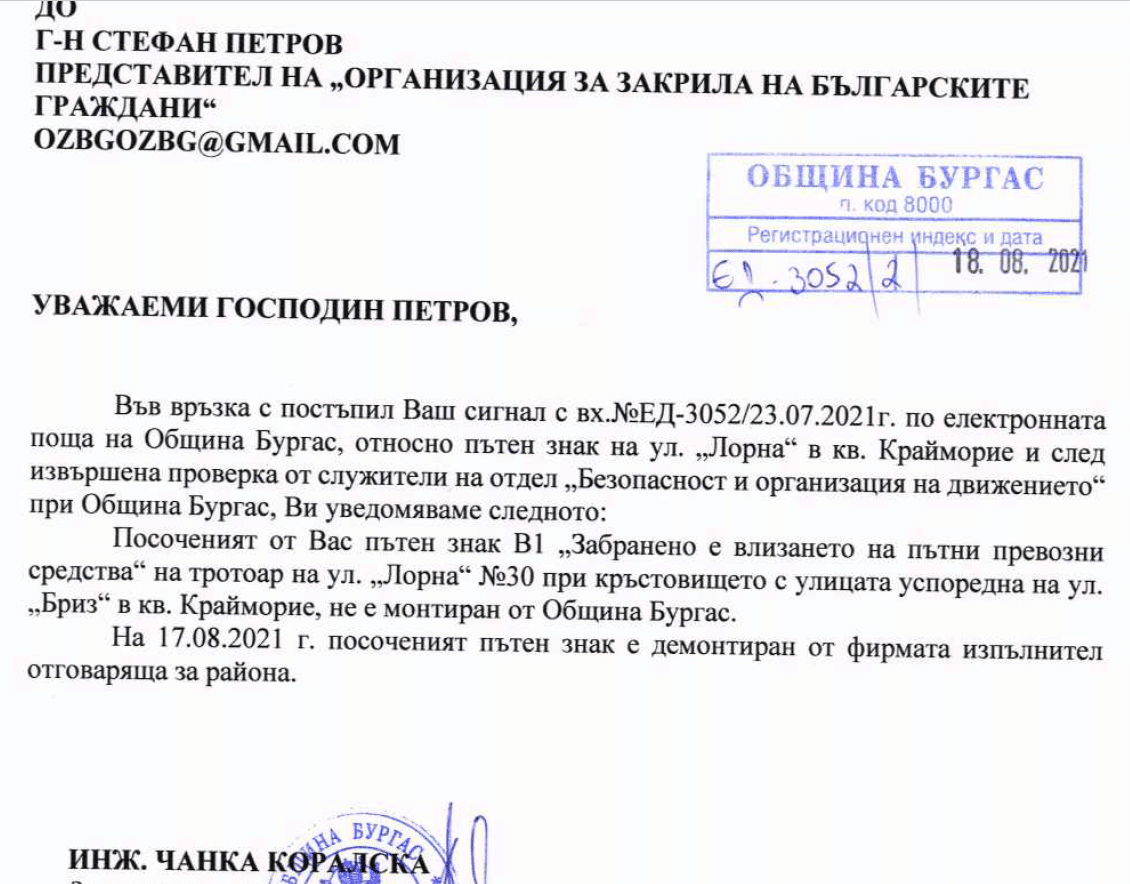 Както и предполагахме, оказа се, че знакът не е поставен от Общината и е демонтиран, за което получихме писмо от зам.-кмета Чанка Коралска: