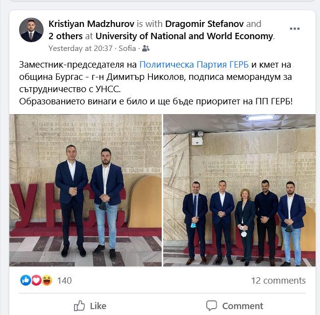 Днешните кадри от университетския двор, в допълнение на снимките на бивши и настоящи членове на Студентски съвет и университетско ръководство в зала „Тържествена“ и при главния вход на УНСС с надписи „Бюлетина №28“ и „За ПП ГЕРБ образованието винаги е било приоритет“ са срамна страница в историята на тази институция. Тук дори не става въпрос за това, че конкретно #НашиятУниверситет беше съсипан по време на точно това управление; не става въпрос и за това, че ако има български политик, който е максимално чужд на идеята за Университет изобщо, това е точно този политик. Тук става въпрос за това, че е адски невъзпитано, антиуниверситетско и брутално агитпропът да се вкарва на университетска територия.