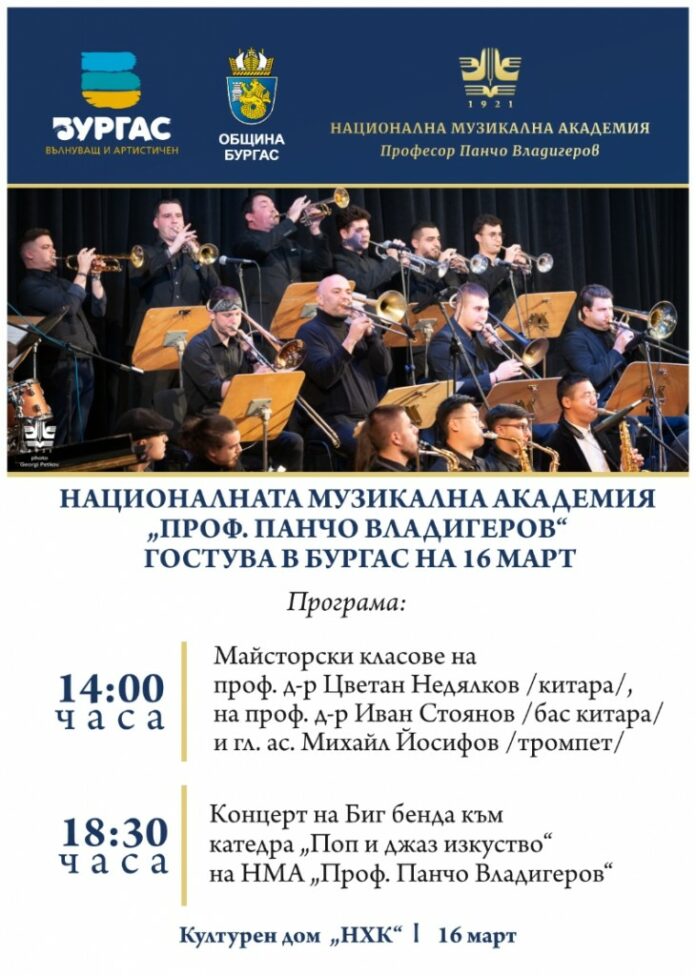 Преподавателите, музиканти и студенти от Националната музикална академия „Проф. Панчо Владигеров“ ще имат голям концерт в Бургас на 16 март, съобщиха от Общината. Те ще презентират дейността на висшето учебно заведение с изпълнения на Биг бенда, който е с художествен ръководител Михаил Йосифов. Концертът ще бъде от 18:30 часа в Културен дом /НХК/.