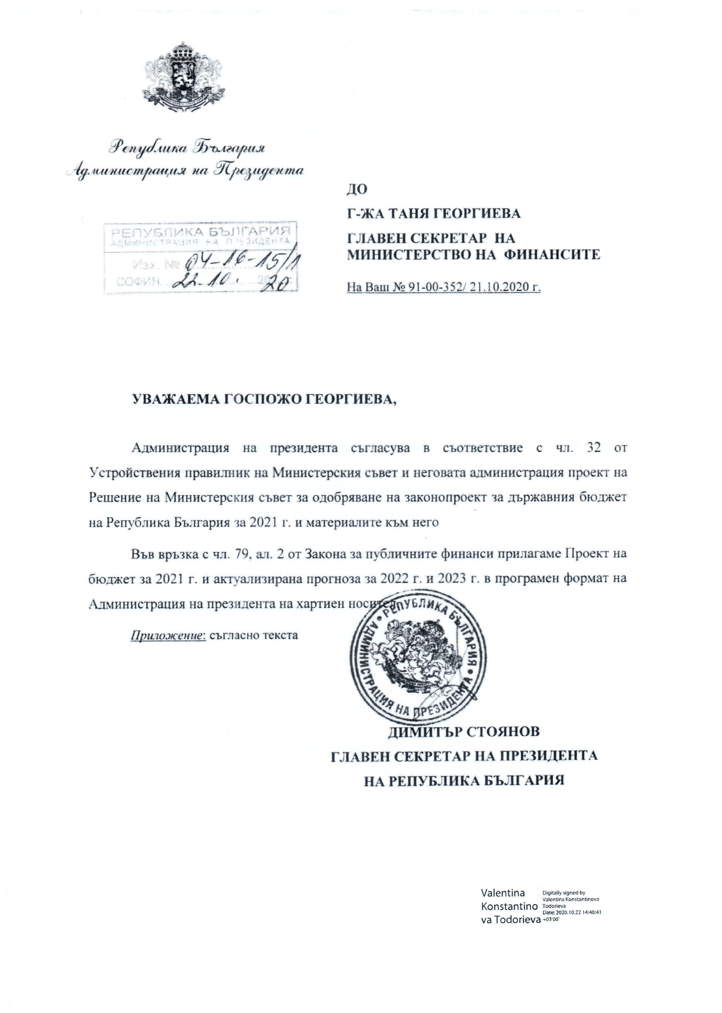 „По повод критичните оценки от страна на президента на Република България Румен Радев за предложения от Министерството на финансите проект на Закон за държавния бюджет на Република България за 2021 г. и Актуализираната средносрочна бюджетна прогноза за периода 2021-2023 г., представляваща мотивите към него, Ви информираме, че Администрацията на президента съгласува документите в съответствие с чл. 32 от Устройствения правилник на МС и неговата администрация без да са изпратени бележки.“