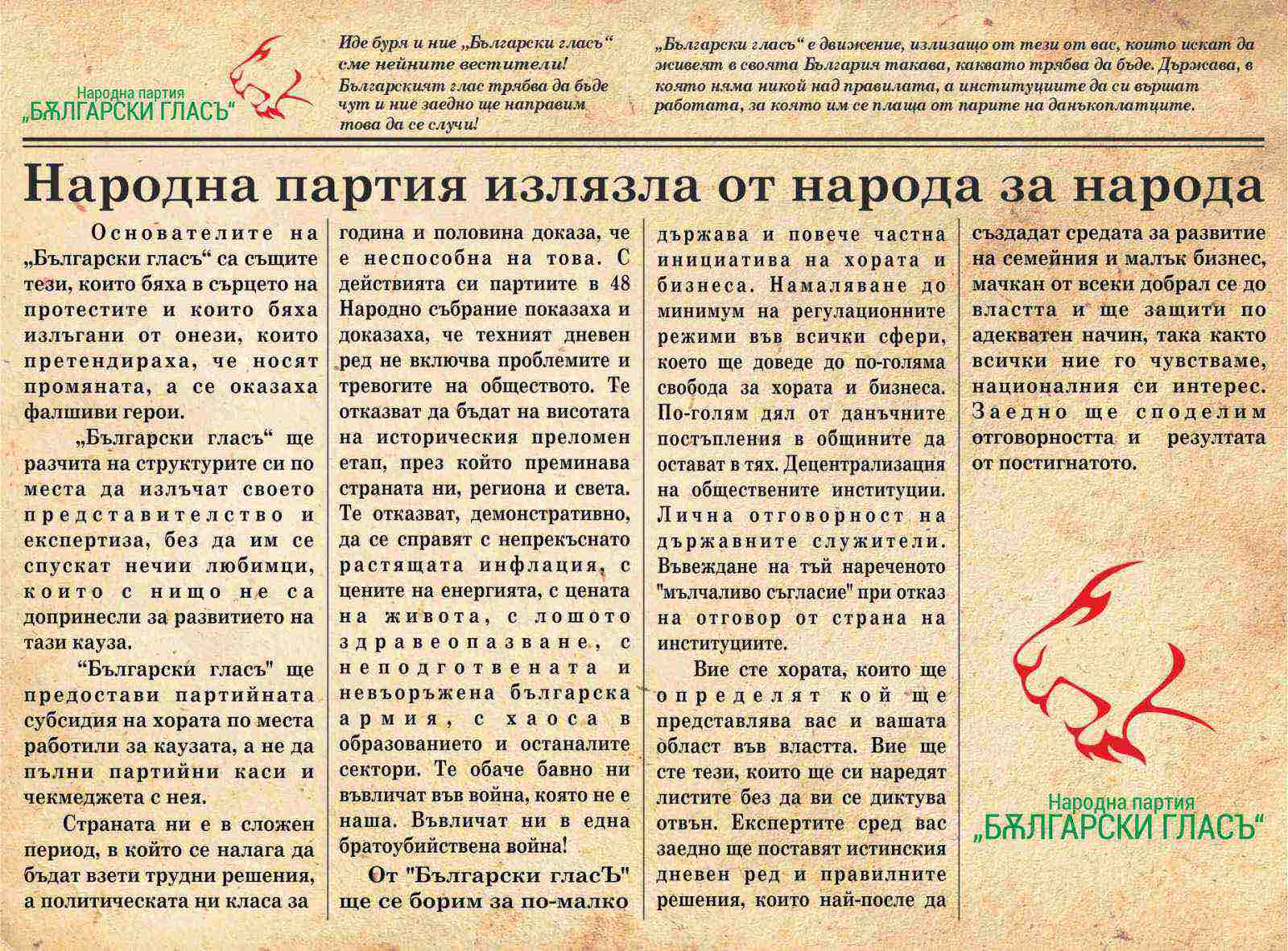 Новата партия „Български гласъ“ няма да пише високопарна програма по примера на останалите играчи на политическата сцена у нас. Тя си поставя за цел да бъдат реализирани няколко конкретни законодателни инициативи, с които животът на българските граждани и начинът, по който функционира българският бизнес, да бъдат съществено променени.