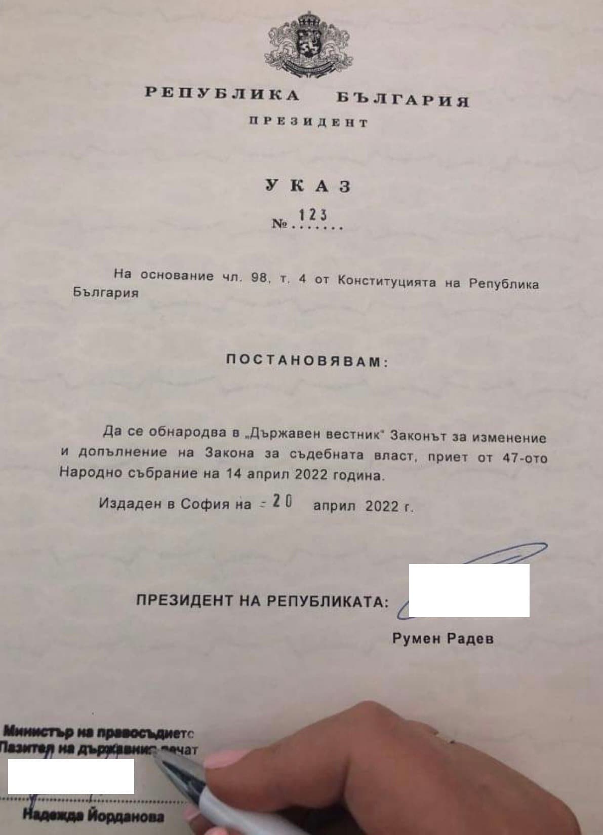 „Днес, в качеството си на министър на правосъдието и „пазител на държавния печат“, подписах Указа за обнародване на Закона за изменение и допълнение на Закона за съдебната власт, приет от 47-то Народно събрание на 14 април 2022 г., с който се закриват Специализираният наказателен съд, Апелативният специализиран наказателен съд, Специализираната прокуратура и Апелативната специализирана прокуратура“, обясни Йорданова.