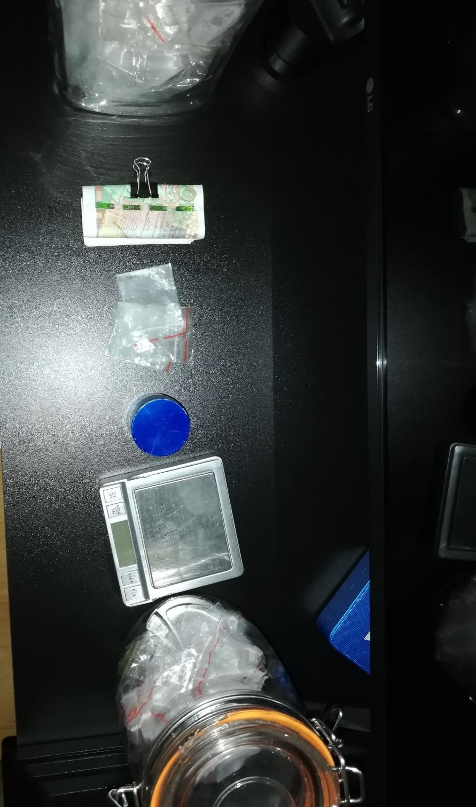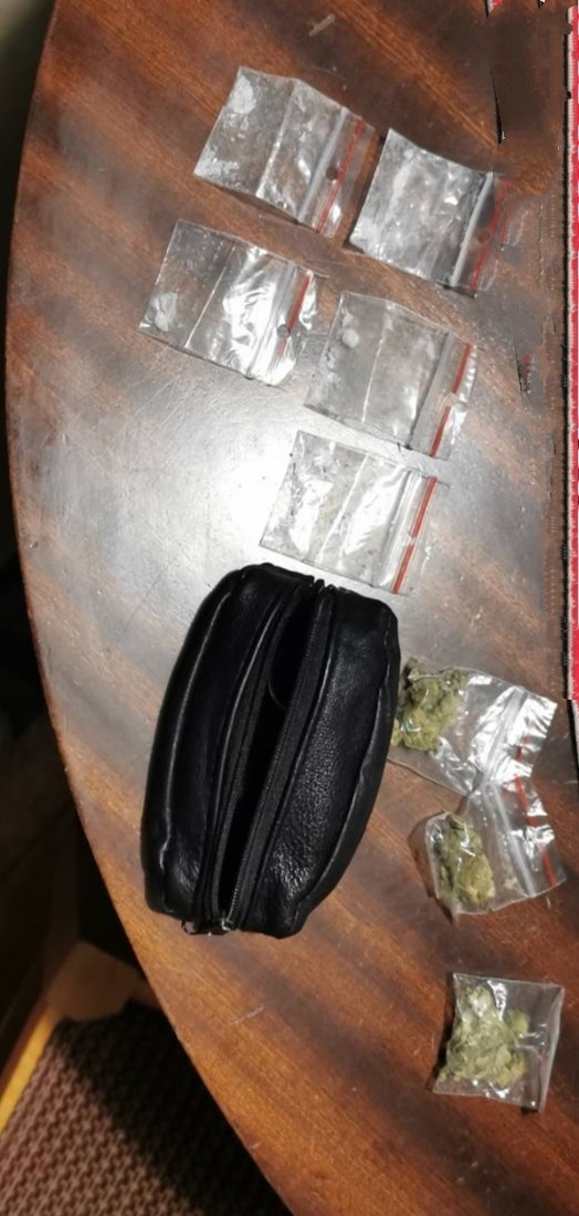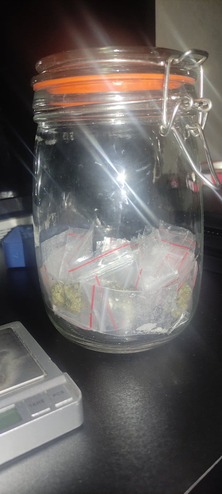 След това е бил претъсен домът на наркоразпространителя, където са били намерени 36 пакетчета с кристали и 9 опаковки с марихуана. Освен това са били открити и 2 електронни везни и значителна сума пари, както и незаконно притежавано оръжие и боеприпаси.