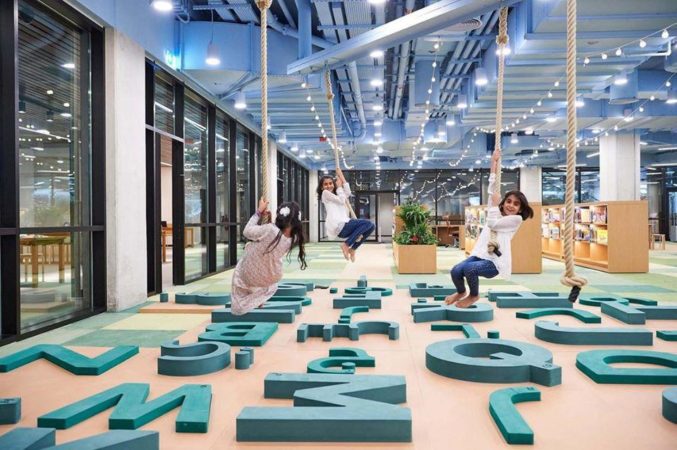 Първият етаж е посветен на спокойствието и тишината, които носи пустинята. Посетителите могат да четат върху пясъчни дюни или да възседнат камила. Вторият имитира оазис и по напоителен канал „текат“ книги.