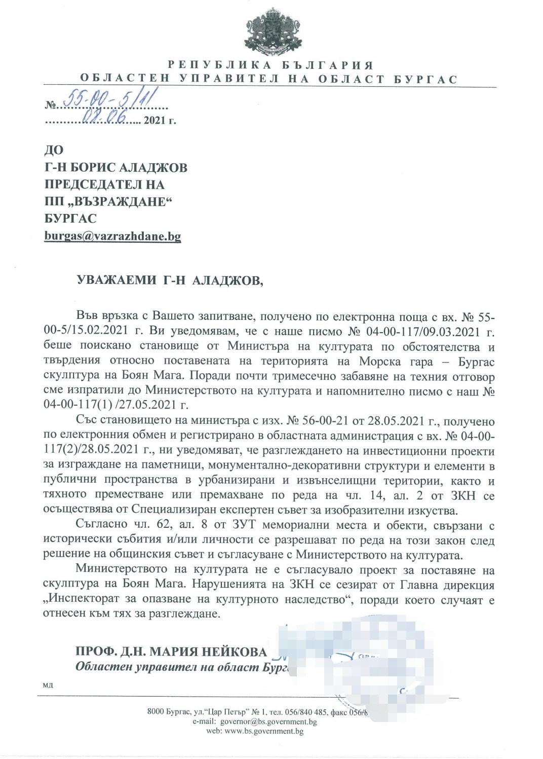 Министерството на културата не е съгласувало проект за поставяне на скулптура на Боян Мага и в резултат на това е назначена проверка. Това става ясно от писмо на областния управител на Бургас проф. д.н. Мария Нейкова до председателя на ПП „Възраждане“ Бургас Борис Аладжов, публикувано в социалната мрежа Facebook.