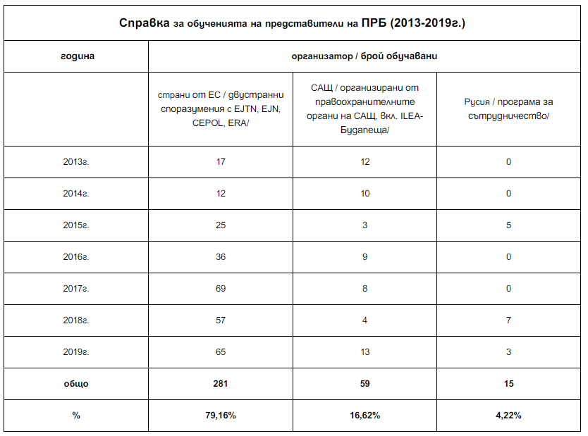 Oбщо 281 прокурори и следователи са били обучавани за периода 2013 г. – 2019 г. по различни програми в страни от ЕС /79,16 %/, 59 – в САЩ и в други страни по обучителни програми, организирани от американски правоохранителни органи /16,62 %/ и 15 – в Русия /4,22 %/.