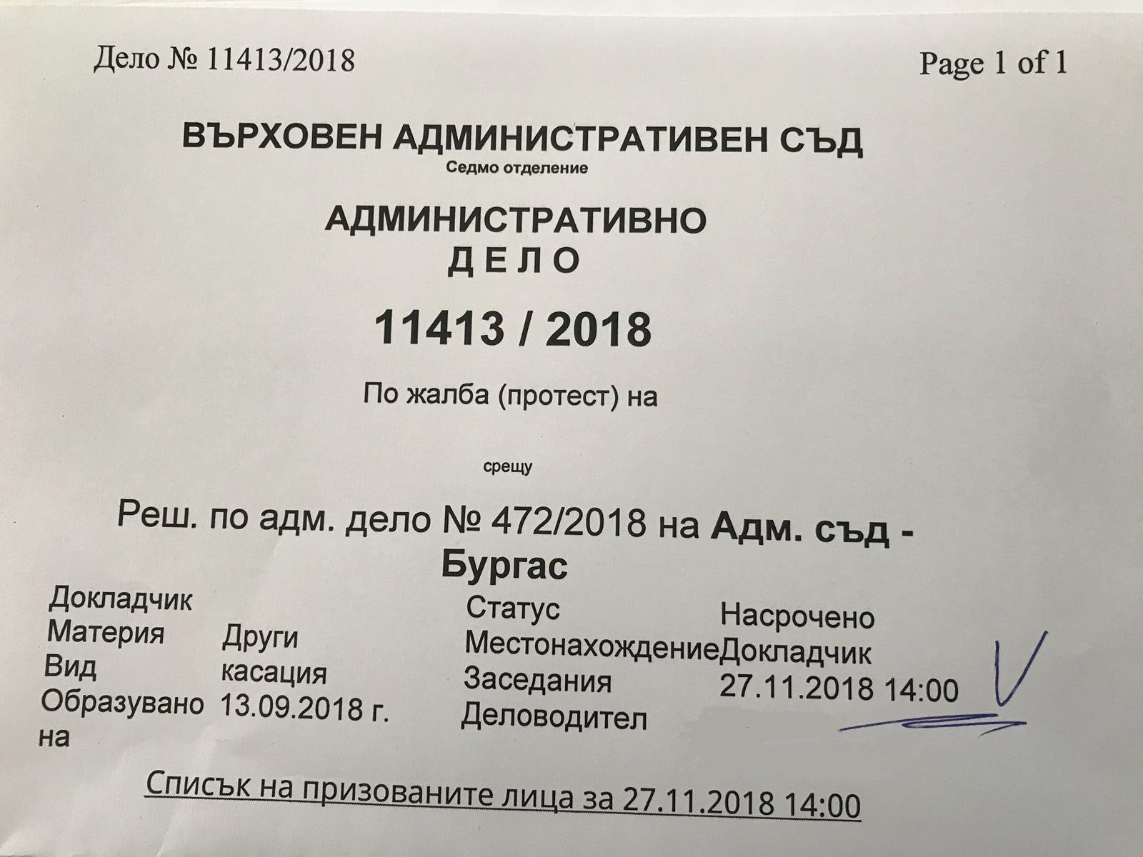 Отговорът на бизнесмена до секретаря по правните въпроси и антикорупция на президента съдържа снимка, която предоставя информация за образуваното две седмици по-рано (на 13.09.2018 г.) административно дело по протест срещу предхождащо решение на Административен съд-Бургас. Самото заседание на ВАС по конкретното административно дело е насрочено за 27.11.2018 г.