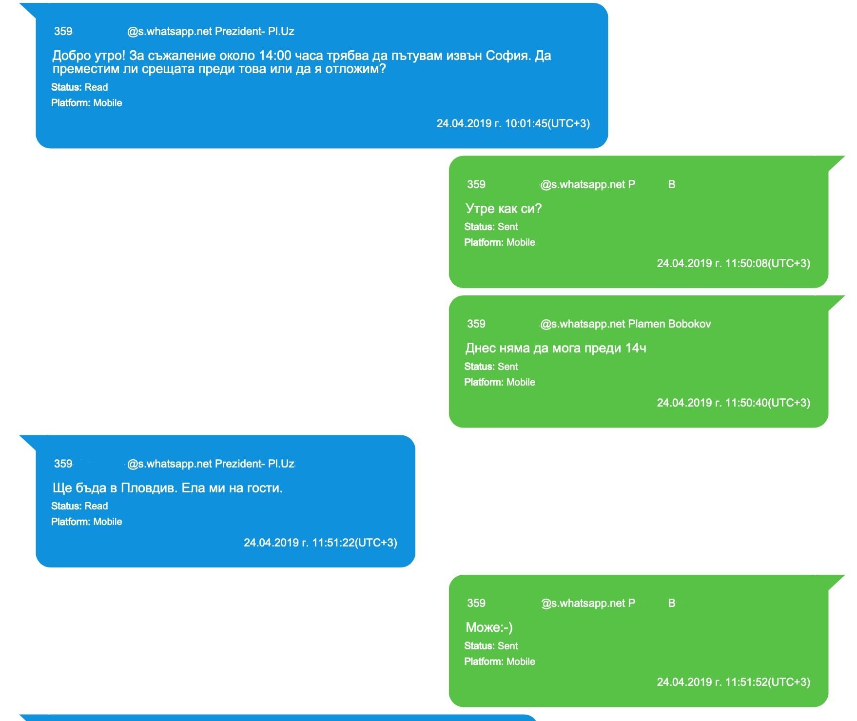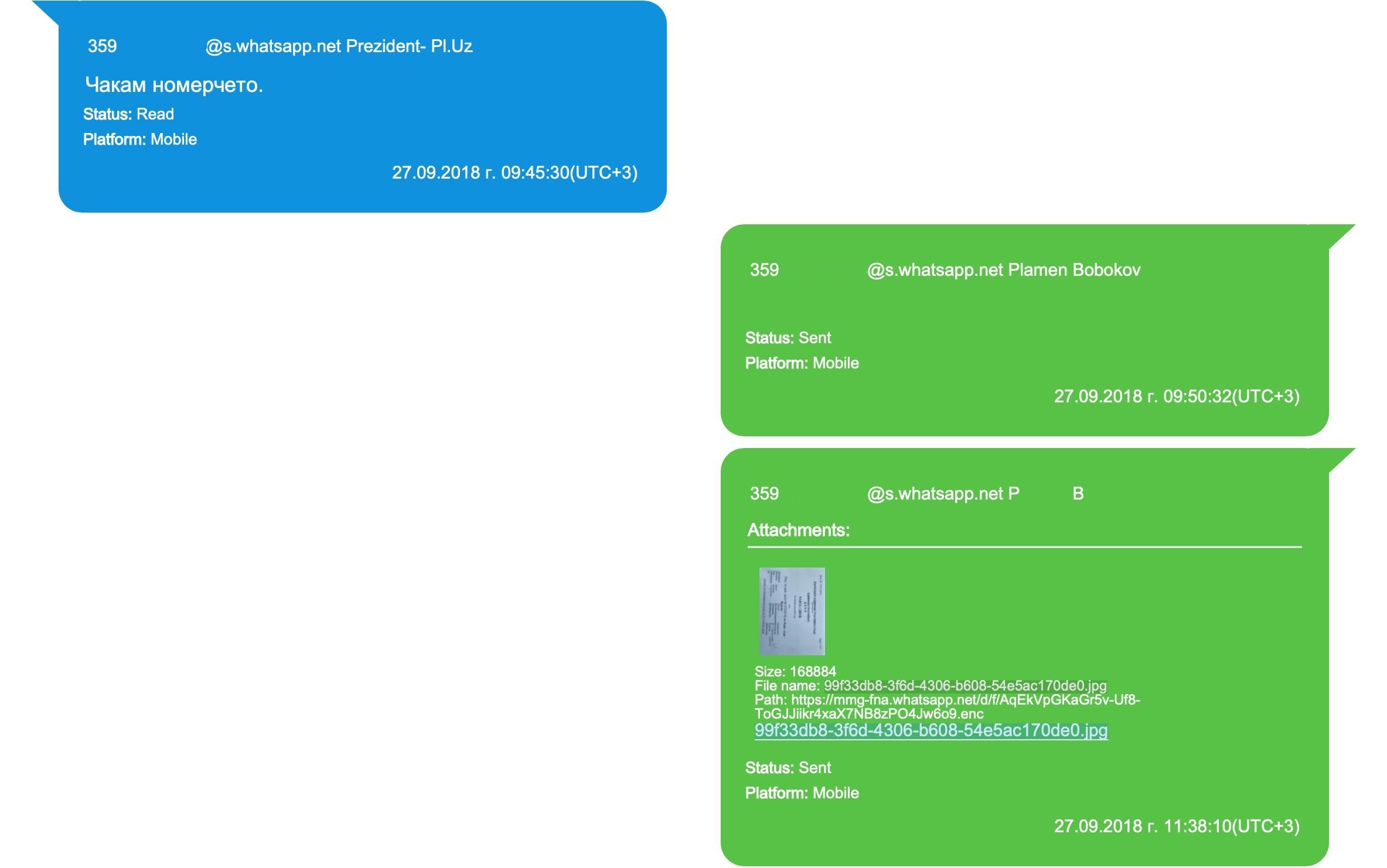 Анализът на разменените съобщения между тях показва още, че двамата са обсъждали предмета на адм. дело №11413/2018 в продължение на 6 месеца. Експертизата на мобилните устройства, използвани от Бобоков, установява, че с „Prezident-Pl. Uzunov” са разменени общо 61 файла, част от които съдържат и горецитираната информация за съдебни дела и решения по тях.