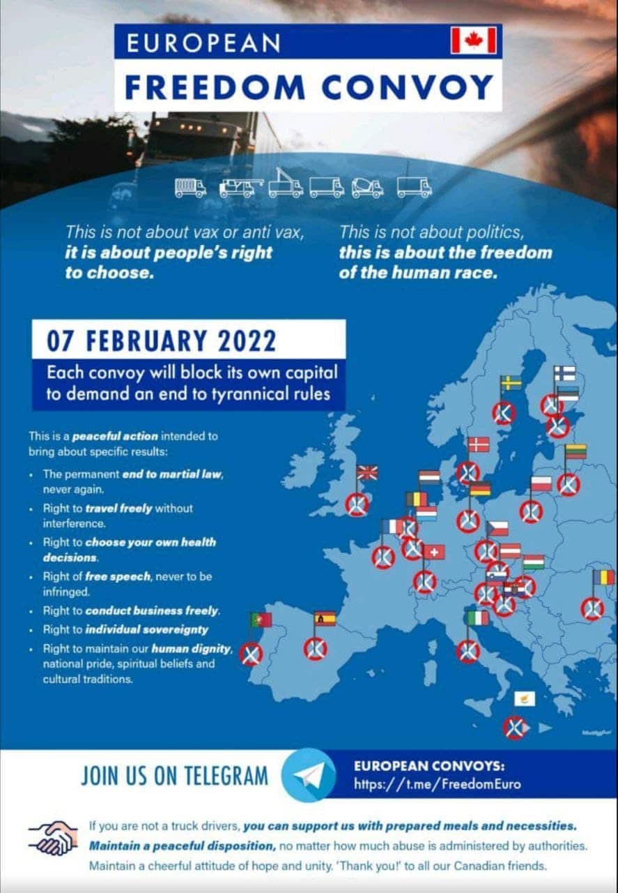 Тези протести са мащабни и безпрецедентни. Хиляди канадски шофьори на камиони, които отказват да се подложат на задължителна ваксинация срещу COVID-19 и да спазват стриктно наложените здравни ограничения, се събраха, за да изкажат недоволството си, близо до района, известен като Парламентарния хълм в Отава, тази събота, 29 януари 2022 г. От тогава насам много други техни съмишленици, продължават да пристигат, като настояват правителството на Джъстин Трюдо да премахне ограничителните мерки и по-специално да премахне задължителния ваксинационен сертификат. Към този „Конвой на свободата“, както го наричат демонстрантите, вече са се присъединили и голяма част от местните фермери, а населението, което очевидно повече не може да търпи тези строги и абсурдни разпоредби, го приветства оживено. Недоволните граждани дори имат моралната подкрепа на милиардера Илън Мъск. Въпреки че почти 90% от канадските шофьори на камиони са ваксинирани, те не са съгласни да спазват задължителната карантина, която е за срок от 14 дни, след пресичане на границата със САЩ.