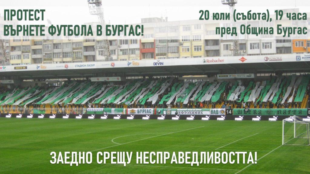 На 20 юли пред сградата на Община Бургас, от 19:00 часа, ще се проведе протест под надслов „Върнете футбола в Бургас“. Събитието е организирано от фенове на перспективния, в далечното минало, футболен отбор „Нефтохимик“.