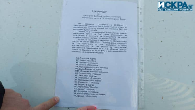 „Имало е днес много сериозен натиск, включително и от регионалния. Вече ще си позволя да говоря съвсем свободно – от Димитър Костов, който е председател на Областния съвет на Българския футболен съюз в Бургас. (…) Имало е натиск, среща с клубовете, не правете глупости, не ги слушайте тези, продължавайте си в този ред. Ние не сме хора втора категория, ние участваме в първенства, всеки един от нас е направил бюджет, стадион, организация. Те не правят нищо друго освен да администратират първенството. Имаме гражданска позиция и я изразяваме. Единственият начин е да направим някакъв протест и да бойкотираме първенството. Чувам се и с колеги от други области.“