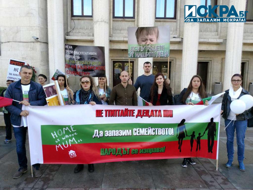 Десетки родители се събраха в 13 часа пред сградата на общината в Бургас с искане за отмяна на Закона за социалните услуги. Държейки плакати с надписи „Долу ръцете от нашите деца“, „Не на трети факултативен протокол! Не на Стратегията! „Да“ на българското семейство!“, те започнаха своето протестно шествие.