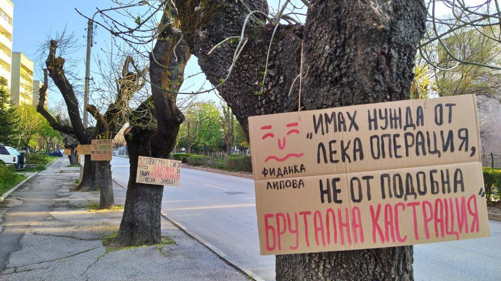 Акцията е с цел да отправи апел към отговорните институции първо да се консултират със специалисти преди да извършват подобно подкастряне и да спрат пренебрежителното и варварско отношение към градските дървета.