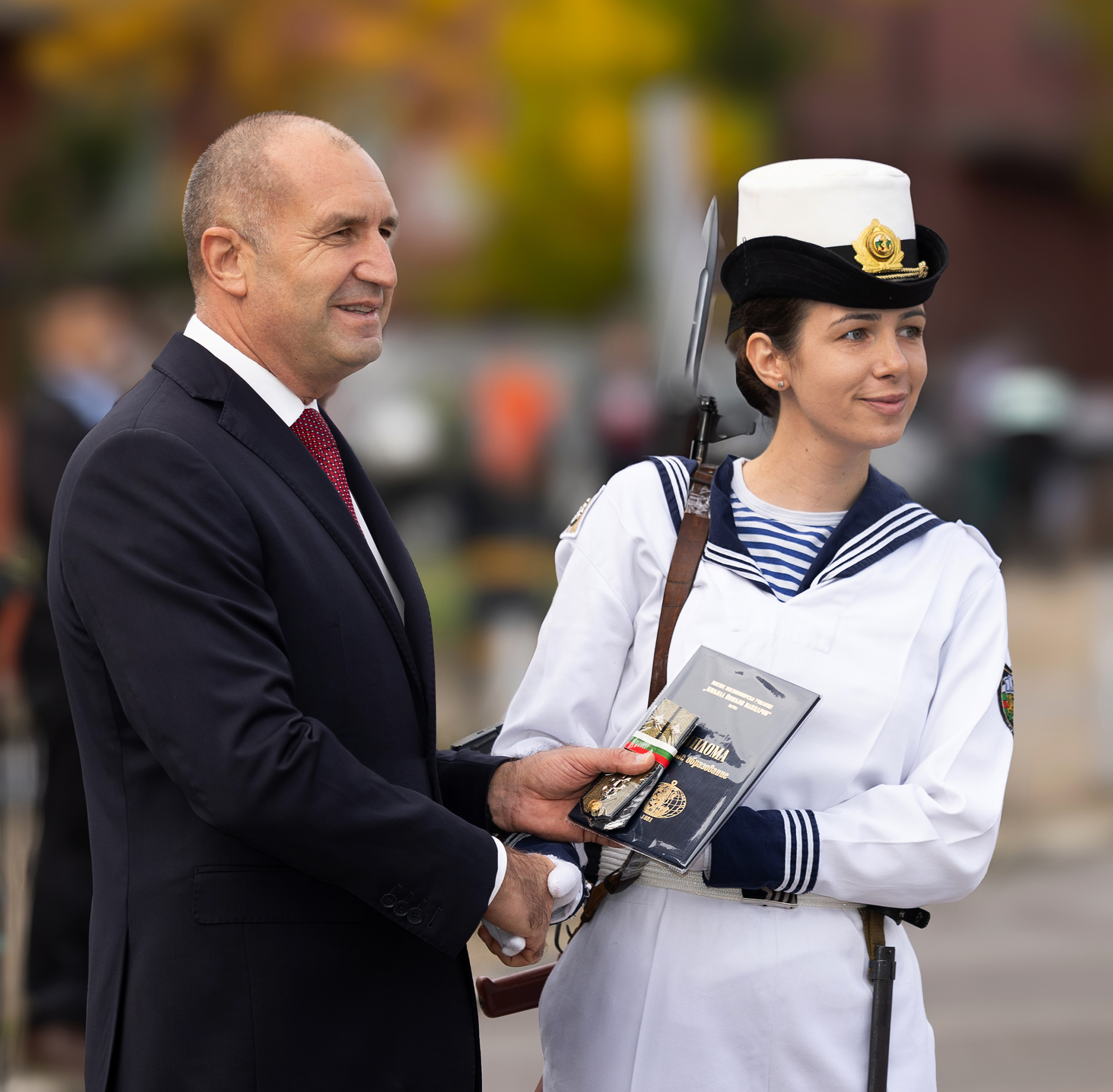Държавният глава и върховен главнокомандващ Румен Радев прие почетния строй и връчи дипломата и пагоните на курсанта първенец – лейтенант Мелани Пиргова. В приветствието си към младите военни лекари президентът Радев заяви, че един от основните фактори за мотивацията и духа на военнослужещите, е именно наличието на бърза и надеждна медицинска евакуация и на ефективна медицинска помощ.
