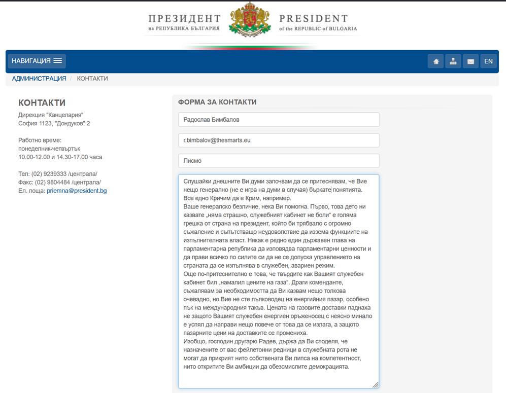 P.S. Понеже се опасявам, че е прекалено зает – пратих му това писмо и официално. Така де, институционално прилежно.
