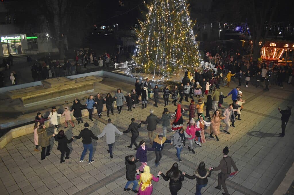 Поздрав за присъстващите бяха изпълненията на солисти и музиканти от Капански ансамбъл, а танцьори от културната институция поведоха хорото на площада. На него се хванаха и три млади дами от Казахстан, студентки в България, които посрещнаха Новата година на площада в Разград.