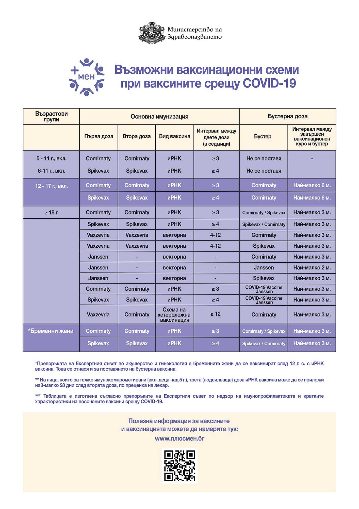Какви са възможните ваксинационни схеми в различните възрастови групи (кои ваксини могат да бъдат „комбинирани“, какъв е интервалът между дозите, каква бустерна ваксина да изберем) – тази и още полезна информация можете да намерите ТУК – част от информационната кампания „Плюс мен“ на Здравното министерство за ползите от ваксините и ваксинацията срещу коронавирус.