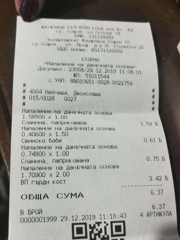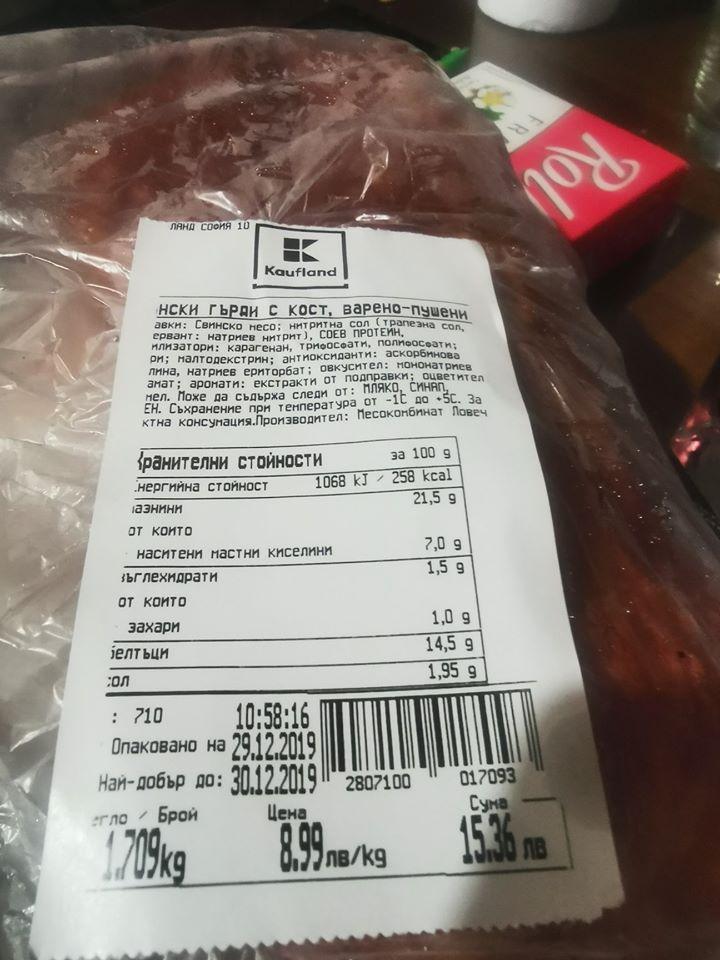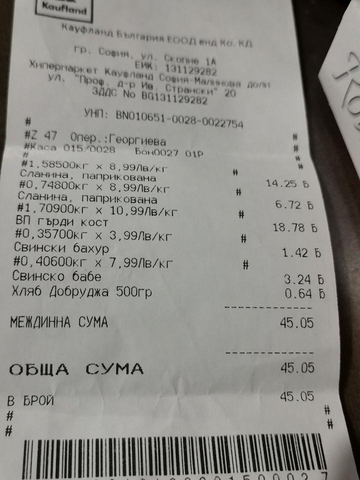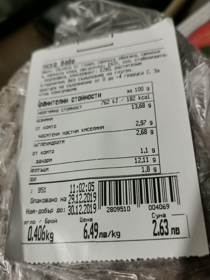 Ще дам само един пример – на етикета, принтиран от апарата на щанда „Свински гърди с кост“ е записано 1,709 кг на цена от 8.99 лв. или 15,36 лв. Когато уникалният баркод на етикета бива сканиран на касата излиза 1,709 кг по 10.99 лв. или 18,78 лв. Абсолютно същото се случи с още 3 продукта. Купих неща, които обикновено взимат пенсионерите. Сланината на касата е с лев по-скъпа, свинското бабе – лев и половина, гърди с кост – с 2 лв.