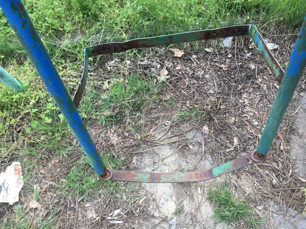 На детската площадка има 4 люлки в окаяно състояние. Едната е изцяло разбита, а от желязната й рамка стърчи ръждив пирон. Родителите са обезпокоени, защото някои деца и така използват съоръжението.
