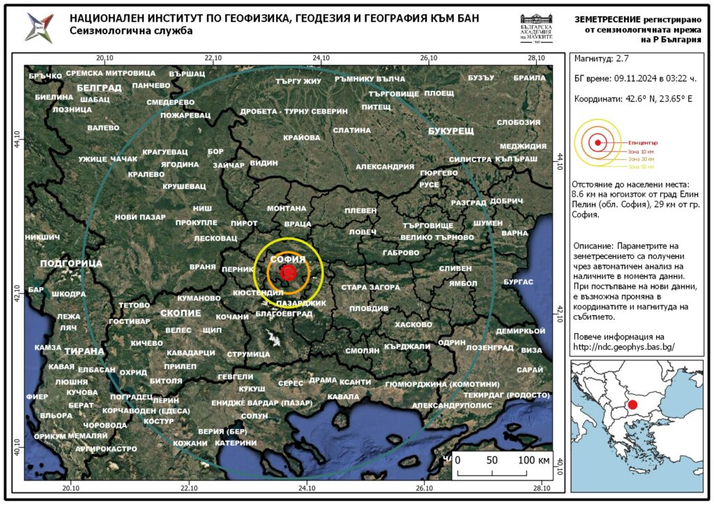 По данни на Националния сеизмологичен център към Национален институт по геофизика, геодезия и география – БАН, събитието от 09 ноември 2024 г., от 03:22 часа българско време е с епицентър на 30 км от град София.