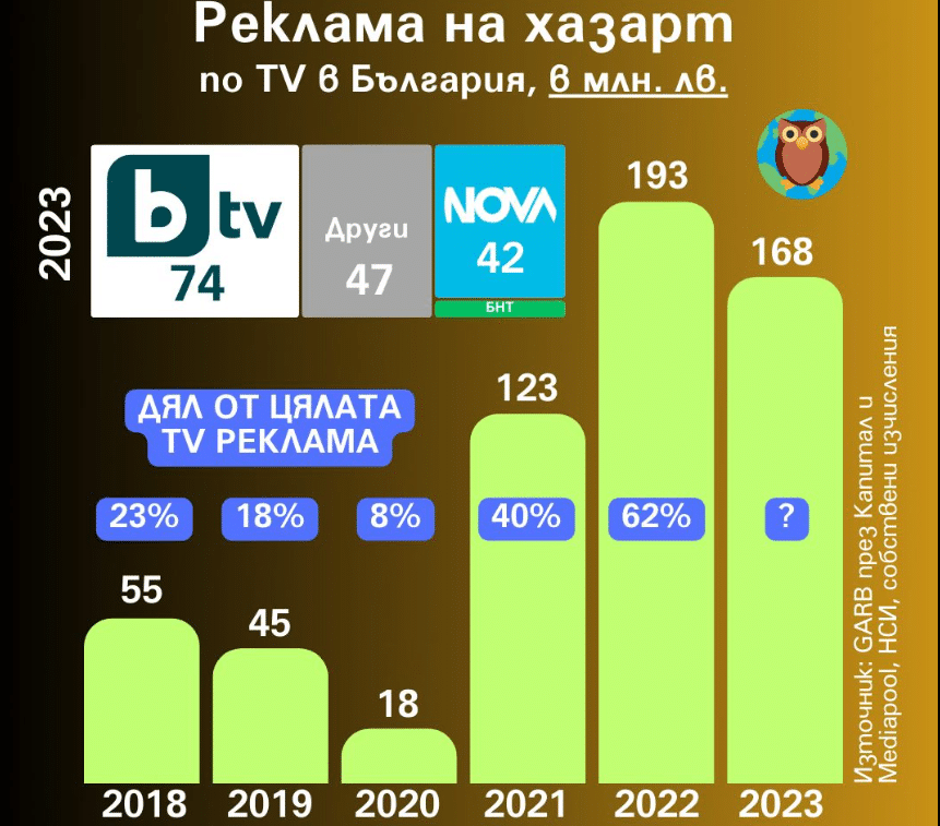 „Предвид данни на НСИ за общите приходи от реклами на всички телевизионни оператори рекламата на хазарт през 2022 съставлява 62% от тях или мнозинството от всички реклами. Това означава, че българските телевизии не биха могли да съществуват в сегашния си вид без сътрудничество с хазартния бранш.